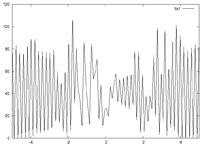 Results of Talbot effect simulations generated with gnuplot. Thanks to Daniel Malacara for providing the expression used, and to Maanit Desai for essential help setting this up in gnuplot. There are twelve .ps plots, and 12 corresponding .gifs. There are three parameters in the calculation: N = number of slits; d = spacing of the slits; sigma = distance to screen in units of the Rayleigh length. I kept d constant at 2.0 for all plots. If you change d the plot just expands or constracts accordingly. For the first four plots I kept sigma = 1.0 and varied N, to show how the sharpness of the image depends on how many slits are involved. plot 1 has N=21 (the maximum practical number in gnuplot) plot 2 has N=3 plot 3 N=5 plot 4 N=11 Then for plots 5 through 12 I kept N=21 and varied sigma, as follows: plot 5 sigma = 0.5 plot 6 sigma = 1.5 plot 7 sigma = 1.25 plot 8 sigma = 1.01 plot 9 sigma = 1.02 plot 10 sigma = 1.03 plot 11 sigma = 1.04 plot 12 sigma = 1.05 These plots show: a: the images at Sigma = .5, 1.0, 1.5 b: the change from sharp peaks as you move away from sigma = 1.0 c: the inversion of the pattern at sigma = 1.25 (fractional TE) To run the program on gnuplot, start gnuplot and type: load "talbot.txt"