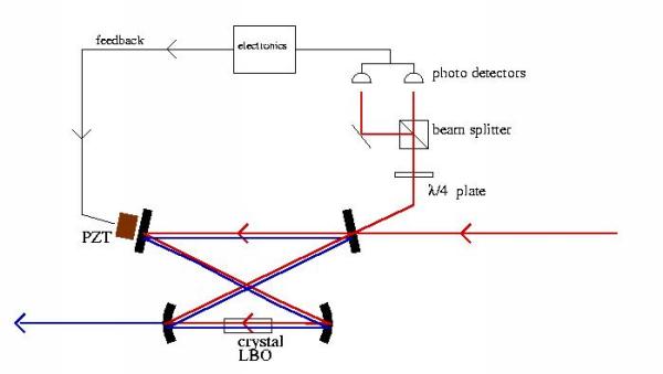 Thermal fluctuations and vibrations can cause the cavity to drift away from resonance, which greatly reduces SHG. Therefore, it is necessary to have a locking scheme to keep the cavity at the frequency of the Ti:Sapph laser.