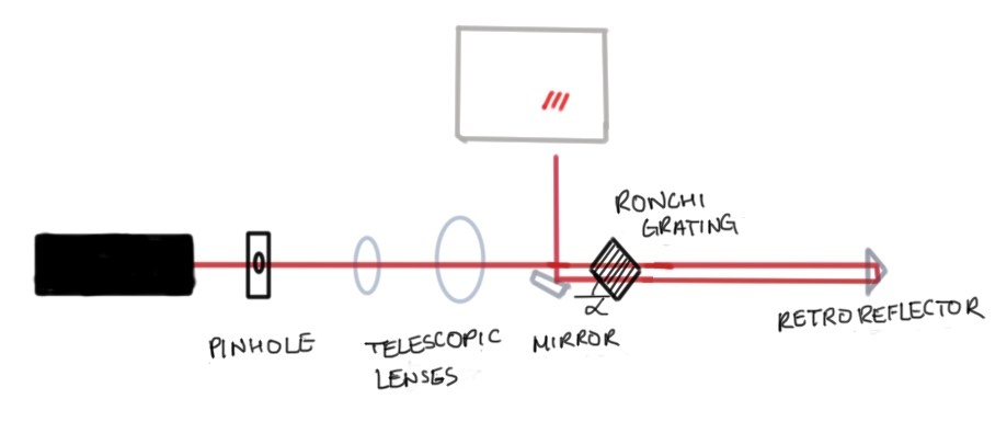 Saturday, September 8, 2012Today, I went back to the lab to work more on the collimation tester we're working on. You can actually see horizontal fringes when the beam is collimated, just as other papers described. They tilt more and more as you move the collimating lens away from the point where the beam is collimated. Dr. Noé and Marty came up with a clever way of tilting the grating and image of the grating w.r.t each other so that you get horizontal fringes. They tilted the holder with the Ronchi grating about 8 degrees and replaced the mirror a Talbot distance away with a retroreflector. The retroreflector looks like a triangle with mirrors on the inside. The beam hits the inside of one edge of the triangle, is reflected to the other edge, and then comes back parallel to the incoming beam. The result of this is that the image of the grating is reflected twice, which means that if the original grating was tilted +8 degrees, the images is now tilted -8 degrees! Right now, I'm trying to understand the various equations that will be involved in the model. Basically, from the fringe angle you can tell the difference in period between the Ronchi grating and its self-image. From there, you know the magnification, and from there, using an equation we found in a paper, you can figure out the radius of curvature of the beam. This can tell you how far to move the collimating lens, and in which direction. This, at least, is what I have surmised. Implementing the process is trickier, so I'm still struggling with Mathematica there. Hopefully I can make some progress this weekend. Here is a quick sketch of the setup:
