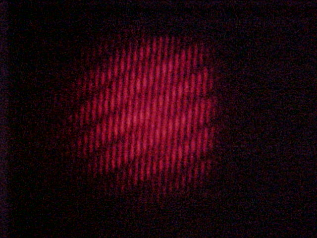 Incident light passes through the grating and forms a self-image as it hits the retroreflector, half the Talbot distance away. The self image is reflected twice, so that the returning light forms the self-image of the grating reflected about the y-axis. This oppositely tilted self-image passes once more through the original grating, creating moirfringes. A mirror placed just before the grating is angled so that it does not block any light, but reflects the fringes off to the side, where they are photographed through white paper with a camera. A collimated beam has a radius of curvature approaching infinity-- or rather, a wavefront that approaches planar. As collimation decreases, the radius of curvature also decreases and the wavefront becomes spherical, creating either a divergent or a convergent beam. If the wavefront is spherical rather than planar, it follows that the resulting Talbot self-image will be either magnified or diminished in size. This magnification of the image of the grating, or lack thereof, is equivalent to placing two gratings of different period on top of each other. Furthermore, the self image is tilted with respect to the original grating, so that the resulting moirfringes will similarly tilt as the period of the self image changes. Following the formula specified by Creath and Wyant (1992), the tilt of the moirfringes can be used to determine the difference in period between the grating and the self-image. This information can be used to find the radius of curvature of the incident light, which can then be used to find out how far the collimating lens must be moved in order to achieve collimation. When the incident light is perfectly collimated, the period of the self-image will be equal to that of the original grating. In this case, the fringes produced will be horizontal. As the beam moves away from collimation, the fringes will acquire a greater tilt from the horizontal; furthermore, fringes produced by divergent light will tilt in an opposite direction from fringes produced by convergent light.