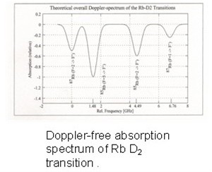 Cross-over Peaks The final spectrum reveals not only the Doppler free peaks that have been discussed, but additional spurious peaks, appearing between each real absorption peak. These spurious peaks are known as cross-over peaks and can arise when there is more than one hyperfine transition under the same Doppler profile, allowing the laser beam the possibility of interacting with two different velocity classes of atoms at the same time. At this point it is useful to recall that the Doppler profile is nothing more than a composite effect of the different velocity classes of atoms that see a range of frequencies Doppler shifted to the lab frame transition frequency of Rb. As such, given two different hyperfine transition frequencies under the same Doppler profile: n1 and n2, corresponding to two different nonzero velocities, V1 and V2 respectively, there are potentially certain laser frequencies, nL that will be concurrently Doppler shifted to both n1 and n2 and absorbed by the two different sets of atoms at the same time. In particular, it turns out that the frequency spacing between the hyperfine transitions is such that a single beam must interact with atoms moving in opposite directions for cross-over peaks to arise. Thus, for a given output frequency, blue shifted transitions in atoms moving in one direction and red shifted transitions in atoms moving in the opposite direction are both excited to their respective transitions by the same beam at the same time. It is important to emphasize that the atomic interaction in each of these two cases corresponds to two completely different hyperfine transitions, for it is impossible for a single frequency to be simultaneously red shifted and blue shifted to the same transition frequency. Now, if both the probe beam and saturating beam are present, the following scenario is established such that each beam interacts with two groups of atoms moving in opposite directions. Since the probe beam and saturating beam are of the same frequency, they each interact with two distinct atomic velocity classes having the same speed, but with opposite directions of movement. Thus, in order to produce cross-over peaks at least four groups of atoms are involved, moving with different velocities: +/-V1, and+/-V2 corresponding to n1 and n2 respectively, where the probe interacts with, for example, the +V1 and –V2 velocity class and the pump beam with the –V1 and +V2 velocity classes. (Here the direction of the probe beam is taken as positive.) So far, given the present situation, the pump beam and probe beam do not interact with same atoms. The probe beam then, although interacting with two atomic velocity classes at the same time, is simply contributing to the Doppler profile as before, but in a two-fold manner. In fact, it is safe to say the reference beam interacts in exactly the same way the probe beam does here and any effect like the sharing of beam intensity between two transitions (resulting in a sudden increase in absorption) can be canceled out. Now it is conceivable that the laser frequency can be swept to a given frequency, nLC such that the -V1 velocity class (red shifted to n1) of the pump beam is the very same velocity class as -V2 (i.e., -V1 = -V2) corresponding to the probe beam (blue shifted to n2). The same would of course be true for the +V1 and –V2 velocity classes due to the symmetry of the velocities described above. A circumstance has thus evolved where the probe and pump beam interact with the same nonzero velocity class of atoms. As a result, like the case for the zero velocity class of atoms discussed earlier, there is a reduction in the absorption of the probe beam and consequently a detected absorption peak. Unlike the case for the lab frame transitions we are after, these blue shifted and red shifted transitions correspond to nonzero velocity classes of atoms and are therefore dubbed spurious. In summary, a crossover occurs when the laser frequency nLC is such that atoms with velocity -V see the pump beam Doppler red shifted to the transition frequency at a lab frame value of n1 and at the same time, see the probe beam blue shifted to the lab frame value of n2 and vice-versa for atoms moving with velocity +V, where n1 = nL(1 - v/c), and n2 = nL(1 + v/c). Since the pump beam is so much more intense, the interaction with the pump beam is dramatically favored. Solving for nL gives: nL =(n2 + n1)/2, which places each crossover halfway between successive Doppler free transitions.