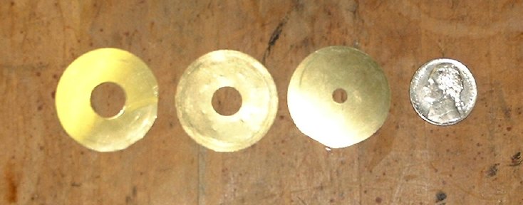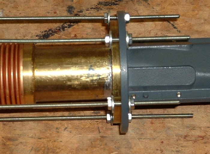 The filter setup in the article is shown in the diagram above. The ends are rectangular-to-circular transitions from a HP series 382A variable attenuator. They allow a transitions from rectangular waveguide commonly used, to the circular waveguide that makes up the filter. Then brass tubes act as a circular wave guide and are attached to the transitions. In the middle are two more pieces of circular wave guide that make up the cavities used as the filter. Irises made of brass shimstock with holes drilled in the center are placed at the ends of the cavities and between the cavities. Once the pieces are aligned they are held in place by threaded rods that pass though the rectangular-to-circular transitions. To change the frequency of the filter the nuts on the threaded rods are loosened, the cavities are taken out, and new ones at the desired length are inserted in their place. Every time a new frequency is desired, new tubes of the required length must be machined. The proposed design replaces the tubes with bellows of variable length. To change the frequency all that would be required is a compression or relaxation of the bellows and a readjustment of the nuts. In order to accommodate the bellows, collars were expoxed to the waveguides so that the ends of the bellows fit snugly over the collars. At his point we have only had one of the bellows in the filter setup. We did not have time insert both bellows into the setup in the time allotted for the rotation. The irises are placed between the bellows in the same manner as before. The bellows are much more flexible then the brass tubes and have a tendency to twist and bend under its own weight. An extra set of nuts was placed inside the holes to restrict the motion in both directions along the rod. This stops the setup from twisting and bending, but at least ten nuts have to be moved to change the length of the bellows.