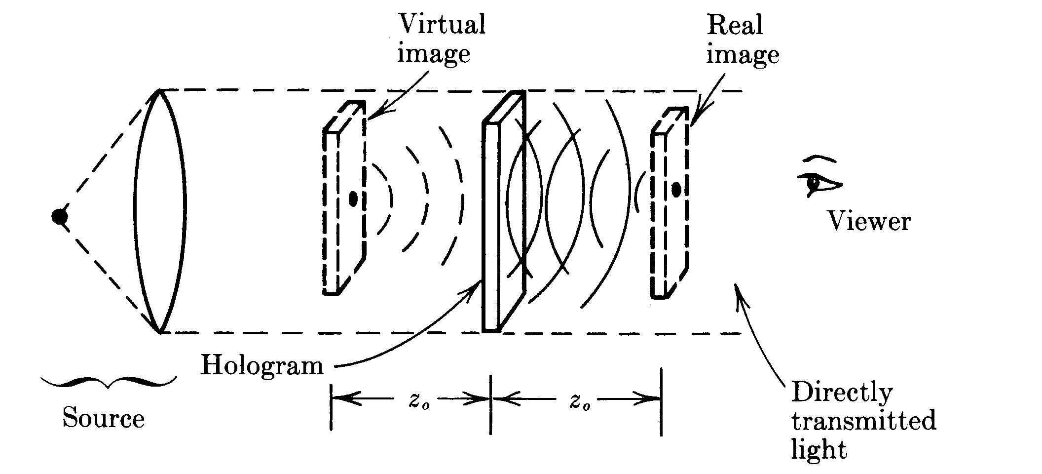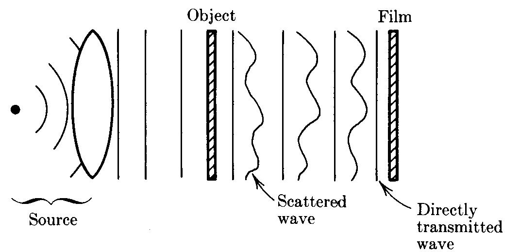 The coherent light produced by the source is transformed into a uniform plane wave by a lens. The uniform plane wave that is transmitted through the highly transmissive object consists of two components. The first is a uniform plane wave and the second is a weak scattered wave. The film records the intensity of the interference pattern at some distance z from the object.