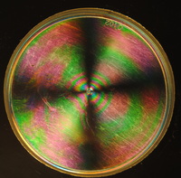 | Dark Maltese cross: The two linear polarizers are creating extinction, which is the dark area around the Pringles can cover. The dark cross in the Pringles can cover occurs because at those points the plastic is not affecting the light that is coming through the first polarizer. Where there is color is where the birefringence of the Pringles can is creating a phase shift in the polarized light coming throught the first polarizers, making it so the polarization is now in a differenct direction, so exctinction will not occur when the light passes through the the second polarizer. |