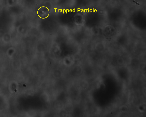 I also had some issues today with making the rose chamber. In theory, this should be a nice chamber: the top made of a cover slide, parafilm walls, and a bottom coverslip to hold in the yeast sample. This is made by heating the parafilm donut onto the cover slide, putting a drop of solution in the middle, and then letting the coverslip dry onto it. I had issues getting the coverslip on right: either there was too much solution and it flowed out, making an unsealed chamber, or there was too little solution and air bubbles appeared. Also, this chamber is very thin and most of the particles are stuck to the bottom, so it's hard to find something to actually trap. I emailed Hamsa and asked her about it, and she said that she had overfilled the sample and then to compensate for the evaporating solution (due to the loose seal) she'd just add water. I think that instead, I'm just going to continue to use the method that I've been using, where I have a cover slip over a hole on card paper, so that the cover slip is supported. The only advantage that I can see of a rose chamber is for upright microscopes, but since this tweezers setup uses an inverted microscope, it shouldn't be a problem. The rest of the day I spent taking videos of particles moving through solution, both in the x and y directions. I'll be able to use these later to measure the particle size, measure the speed of the particle when it falls from the trap, and from this calculate the trapping force. Monday, July 29, 2013I remeasured the efficiency of the tweezers setup this morning, using the photodiode attached to the voltmeter again. I was able to get more accurate readings this time by actually visually looking at where the laser dot was on the photodiode and centering it, as well as turning off the lights to eliminate all of the outside noise. This time the conversion factor was 3.53 mW/mA, and the total efficiency of the system was 30%. ![]() I found a yeast particle and trapped it, and was able to play around with the camera software and take a series of images. I calculated using the magnification of the system that the yeast particle was 7.1 μm. On the topic of magnification, I talked to Dr. Noé about why my theoretical calculations may have been off, and we realized that the focus at 3.2 mm isn't the object distance unless the image is at 160 mm. Instead, you can find the focal length using the focal length equation 1/f=1/i+1/o, where i is the image distance and o is the object distance. This means that the focal length of this objective is 3.14 mm. Using this equation once again to find the object distance if the image distance is 210 mm (which it actually is), I calculated the object to be at 3.18 mm, which gives a magnification of M=210 mm/3.18 mm=65.94. While it's nice to know that I have a corrected calculation, this result unfortunately didn't help my margin of error, as this gives a higher system magnification than before, which was already too high. I next finished my setup for the stage translation in the x direction. (Once I perfect the x direction, I'll use this model for the y as well.) I calculated about how fast the stage should be moving for the particle to stay in the trap, using the Stokes Drag Theorem equation F=6πηrν for a 7 μm yeast cell in water, assuming the force of the trap was ~5pN. This came out to less than 100 μm/sec, so I realized that with the motor diameter of 13 mm and the dial diameter of 25 mm that translated the stage at 255 μm/sec, I would need to extend the dial diameter to around 90 mm. I looked around for a while and tried a number of designs, before settling on using an empty plastic wire spool and sawing off the large rings on the end, which I then taped to the dial and wrapped in foam tape to make a nice surface for the tape to stick to. I trapped another particle (5 μm) and was able to capture a video of it as it stayed in the trap for around 300 μm travelling at 91 μm/second (which I calculated from the video shown below, as it took 2.71 seconds to cover 2 1280-pixel screen lengths), which means that the trap was greater than 4.3pN (the drag force on the particle). I think that to find the actual trap strength, I'll try an use one consistent particle and attenuate the beam until it falls from the trap, as the trapping force is directly proportional to beam power.