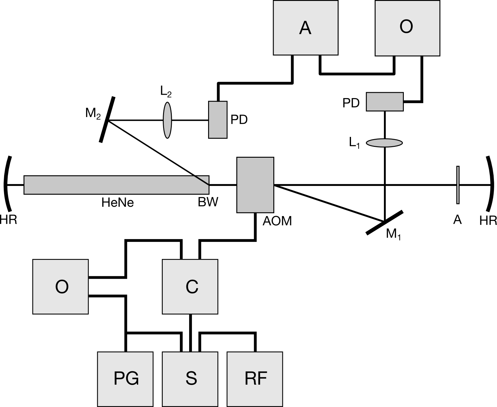 HR, high reflector; HeNe, helium neon tube; BW, Brewster window; AOM, acousto-optic modulator; A, aperture; M1, clipping mirror; L1, 75.0 mm lens; M2, mirror; L2, 25.4 mm lens; PD, high speed photodetector.