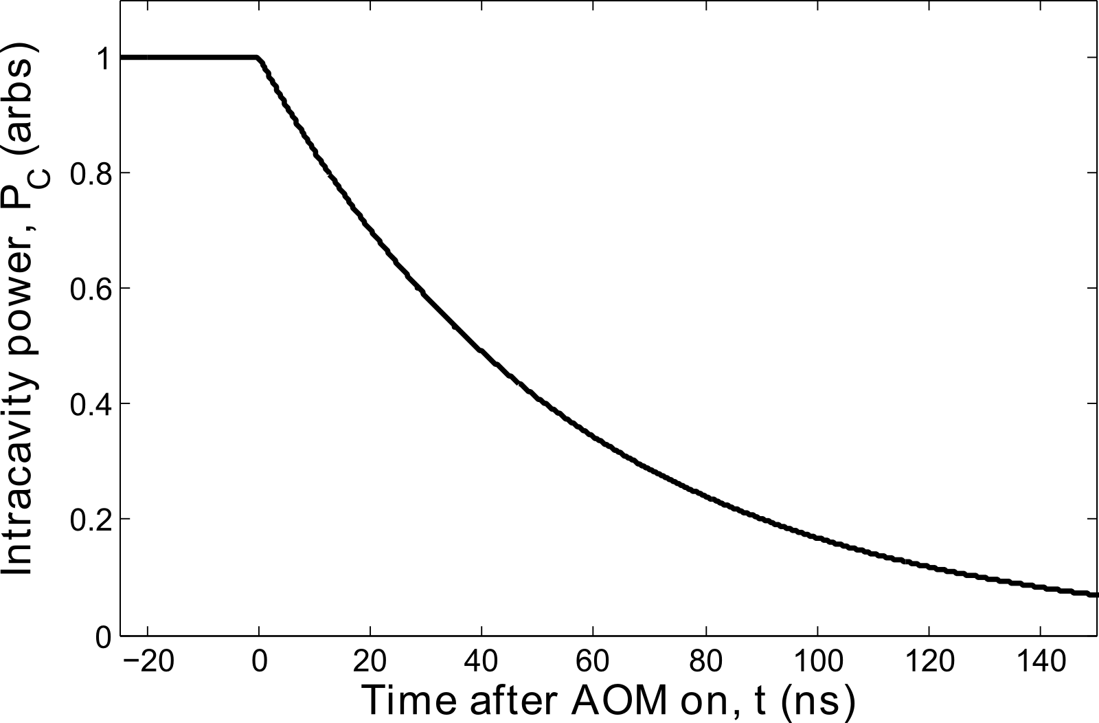 t seconds after AOM on, for one-pass AOM efficiency η, cavity length L, and initial power P0.