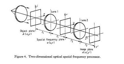 ![]() This pattern is formed perpendicular to the slits of the grating. As previously stated, the middle maximum represents the light that passed straight through the grating. The further out the maxima, the more the light had to bend around the grating's edges in order to concentrate intensities at those spots. The middle maximum is called the zero order, and first side maxima are called first order, and so on. High spatial frequencies in Fourier mathematics correspond to high diffraction orders in diffraction patterns. Thus, for all objects, the frequencies located at the edges of the intensity pattern in the Fourier plane correspond to higher spatial frequencies. The lower spatial frequencies (for which the light did not bend as much) are located in the middle of the Fourier plane. A lens is usually used to create a pattern called Fraunhofer diffraction in its focal plane. (This is why a lens is sometimes referred to as a Fourier transform.) The back focal plane of the lens will then become the Fourier plane of the setup, and this is where the diffraction pattern or the Fourier transform of the object is located. Thus, in most cases, after the light passes the focus of this lens and its diffraction pattern is formed at the focus, it begins to again interfere to reform the image of the object. Theoretically, however, the image is never truly focused if the object is located a focal length away from the lens, so a second lens is needed to bring what would be an infinite image distance to a particular, finite image plane. (In other words, a second lens located a focal length away from the Fourier plane makes the infinitely far away image focus on the image plane.) In the experimental setup, then, a second lens is located a third focal length away from the Fourier plane and performs an inverse Fourier transform on the diffraction pattern, forming an inverted image of the object in its back focal plane. (See picture of 4f Setup, source: http://www.iop.org/EJ/abstract/0034-4885/35/3/305) The 4f setup makes locating the exact position of the Fourier plane and the image plane simple (everything is one focus apart). If the lenses are identical, then the image magnification is -1 (the image is simply inverted).