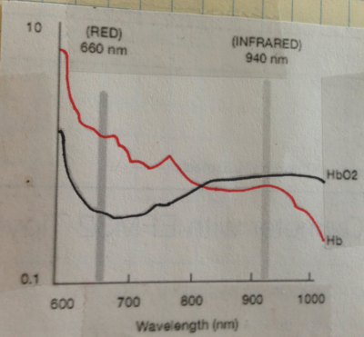 Oxygenated and deoxygenated hemoglobin absorb red and infared light differently. This fact is exploited by pulse oximeters, which shine a red and infrared light through a blood-rich section of the body and then measure the difference in the intensity of the incident and reflected light with a photo sensor. Deoxygenated blood absorbs less light in the infrared and more light in the red, while oxygenated blood absorbs light in just the opposite way.
