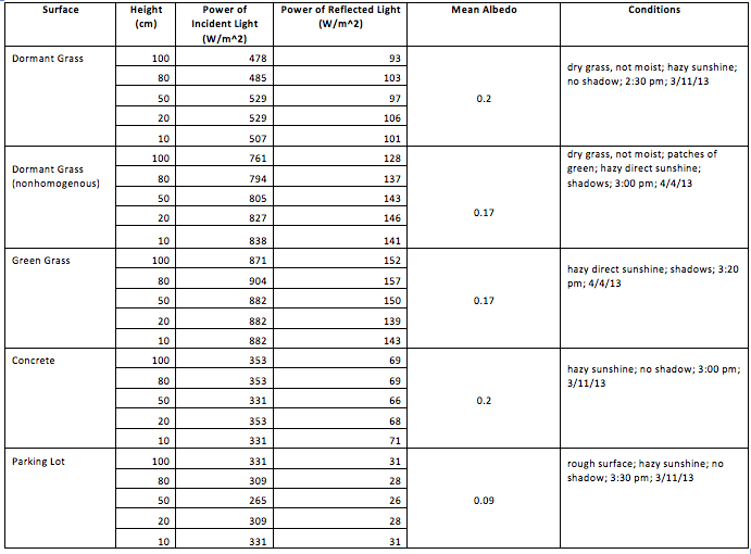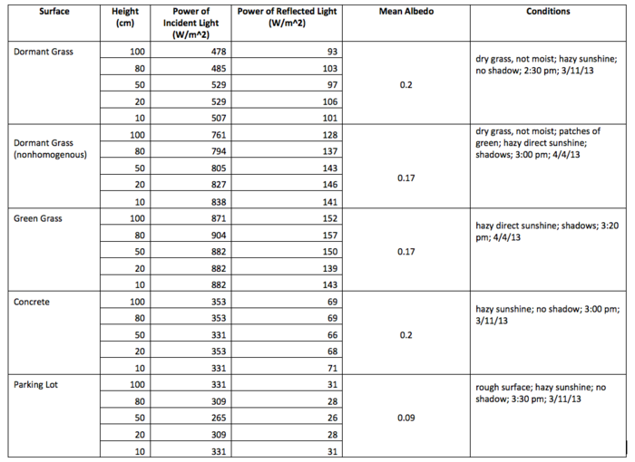 We calculated the albedo of the surfaces by dividing the intensity of the incident light by the intensity of the reflected sunlight. We found the mean albedo of grass to be twenty percent; the mean albedo of concrete to be twenty percent; and the mean albedo of the parking lot to be nine percent. We performed a single measurement for the albedo of dark soil and found its albedo to be seven percent. All of our calculated albedos fell within the range of natural landscape albedos others had reported.