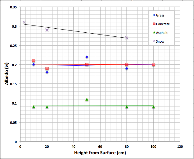 Experiments to do:-Measure albedo of grass, concrete, and blacktop with filters (effectively measure visible light albedo) -Measure albedos of Lambertian surface as a function of height from surface and detection angle.