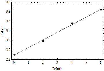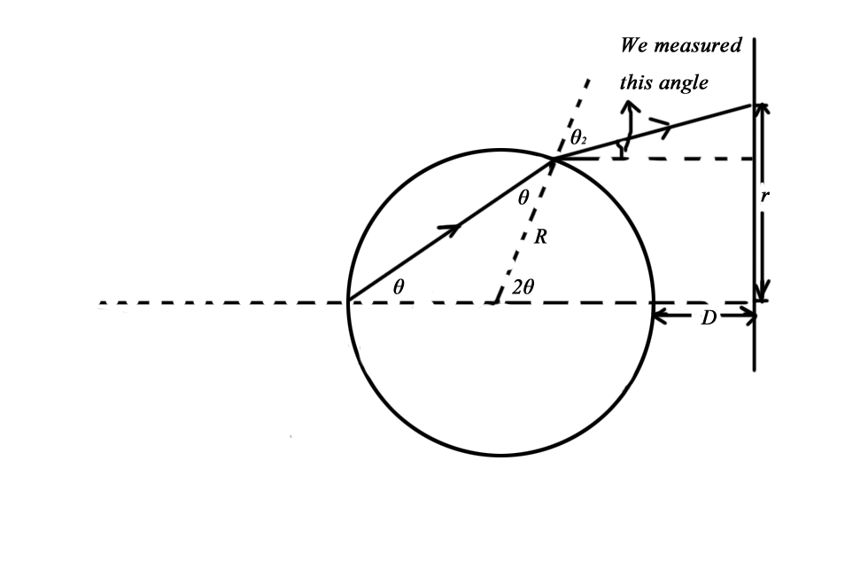 However, I later realized that this is not the whole story. Light from the maximum angle does not necessarily form the outer edge of the ring. The concentration we saw with our eyes is due to the limit of maximum radius, but not the limit of maximum angle in this system. It turns out that the condition of the maximum radius is closely related to the position of the screen. Our explanation of the "laser rainbow" may not be complete, since we only took the maximum angle into account. The peak of the radius with respect to the reflective angle actually shifted when we moved the screen back and forth, which means the angle of the outer-most light is not the maximum angle. Wednesday, November 14, 2012John discussed the report with me. We decided to divide the report into 4 main parts. They are introduction, mathematical simulation of rainbow, simulation of rainbow in reality and the related concentration phenomenon. We measured the diameter and the weight of the sphere we used to do the simulation. The density of the sphere is about 3.1g/cm^3. We had a really hard time to decide what the material of this sphere is, which is closely related to the refractive index. However, we did not make much progress today. We also decided to do some measurement in the concentration phenomenon we discovered few weeks ago. It is possible for us to make quite accurate measurement of the angle between the emergent light and the outgoing light. We can do this by simply measuring the change of the radius of the disk on the screen with respect to a change in the position of the screen. The relationship of them should be linear and the slop is the angle we want. We tried to do some crude measurement today. The result is shown below. The angle is about 9.1 degrees and the predicted value with n=1.5 is 10 degrees. They are quite close to each other. However, I first made a mistake in the calculating, which made both of us quite confused of the sphere. When the problem solved, the result is just good.