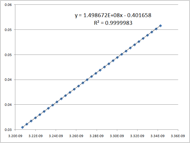 For my second trial (with the Fabry-Perot), I obtained a measured value of the speed of light in air of 2.9973 x 108 m/s. A graph of the data from the second trial follows: