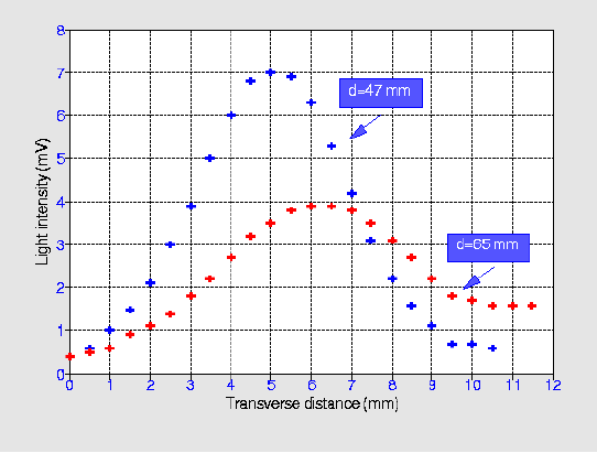 The graphs show the gaussian profiles of the laser beam coming out of the