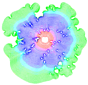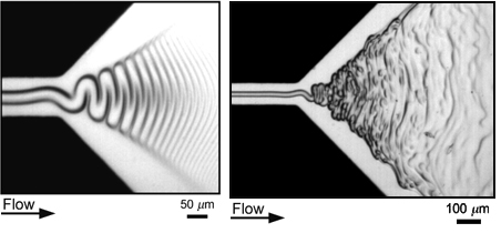 | Misicible Flows The precise manipulation of miscible fluids with large viscosity contrast flowing co-currently at the microscale is an important challenge in science and engineering. Passive and active methods are investigated to enhance mixing between laminar fluid streams. Examples of application include the enhancement of chemical reactions between widely disperates species, such as between viscous material, including complex fluids, and less viscous fluids, including solvent. |