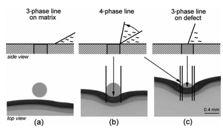 | Wetting and Dewetting The motion of a contact line (fluid/fluid/solid interface) often takes place on a non-ideal surface. Surface modifications and patterning allow for manipulating advancing and receding contact line dynamics, which can be used to confine and displace minute amount of fluid on a surface. |