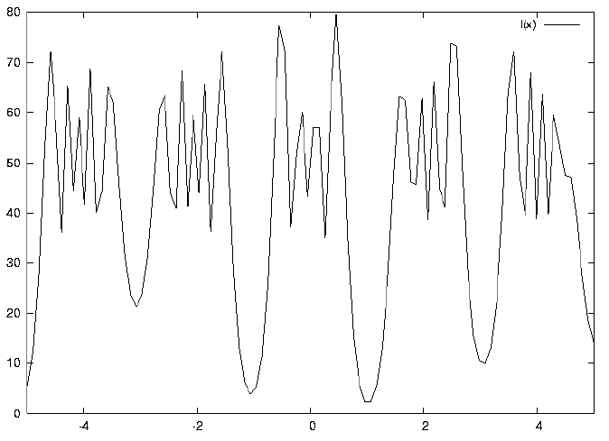Results of Talbot effect simulations generated with gnuplot. Thanks to Daniel Malacara for providing the expression used, and to Maanit Desai for essential help setting this up in gnuplot. There are twelve .ps plots, and 12 corresponding .gifs. There are three parameters in the calculation: N = number of slits; d = spacing of the slits; sigma = distance to screen in units of the Rayleigh length. I kept d constant at 2.0 for all plots. If you change d the plot just expands or constracts accordingly. For the first four plots I kept sigma = 1.0 and varied N, to show how the sharpness of the image depends on how many slits are involved. plot 1 has N=21 (the maximum practical number in gnuplot) plot 2 has N=3 plot 3 N=5 plot 4 N=11 Then for plots 5 through 12 I kept N=21 and varied sigma, as follows: plot 5 sigma = 0.5 plot 6 sigma = 1.5 plot 7 sigma = 1.25 plot 8 sigma = 1.01 plot 9 sigma = 1.02 plot 10 sigma = 1.03 plot 11 sigma = 1.04 plot 12 sigma = 1.05 These plots show: a: the images at Sigma = .5, 1.0, 1.5 b: the change from sharp peaks as you move away from sigma = 1.0 c: the inversion of the pattern at sigma = 1.25 (fractional TE) To run the program on gnuplot, start gnuplot and type: load "talbot.txt"
