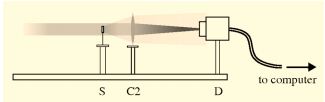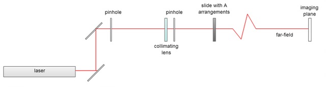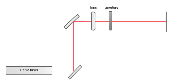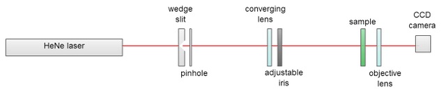 ![]() The set up described in the paper had two main parts: a collimator and detector. The collimator included a HeNe laser, with λ=632.8nm and a nominal power of 5mW, whose intensity was controlled using a sliding wedge-slit; a pinhole; a collimating lens; and an iris. The purpose of the collimator is to produce a parallel beam. The detector was made up of the sample, a collector lens, and a CCD camera. The purpose of the detector is to capture the image of the diffraction pattern.
