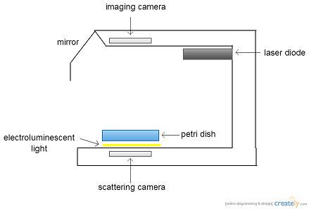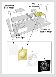 Papers to read: Modeling light propagation through bacterial colonies and its correlation with forward scattering patterns ; Analysis of time-resolved scattering from macroscale bacterial colonies; Label-free detection of multiple bacterial pathogens using light-scattering sensor; Automated classification of bacterial particles in flow by multiangle scatter measurement and support vector machine classifier; System Automation for a Bacterial Colony Detection and Identifcation Instrument via Forward Scattering June 20th, 2013Portable Bacterial Identification System Based on Elastic Light Scatter Patterns This paper outlines the specifications of a low-cost, environmentally-friendly, portable, and speedy microbial-identification system that relies on forward-scatterometry. The final system includes a nine pound 12" x 6" x 10.5" machine, which utilizes elastic light scattering to capture bacterial colony characteristics and delivers the colonies' classifications via wireless access. The device comprises of 2 CCD cameras, a rotational and translational stage, and a 635-nm laser diode. The system employs software algorithms, such as the Hough transform, 2D geometric moments, and the traveling salesman problem to count the number of colonies and calculate their circularity, to center the colonies, and to minimize the travel time between colonies. An "in-the-field" test was conducted by using the system to identify four different types of bacteria on both pure and mixed plates in a number of locations and was found to be between 95 and 100 percent accurate. The device has possible applications in biosecurity, food safety, and monitoring and preventing nosocomial infections, hospital-acquired infections.