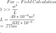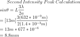 Marty then worked with me and Melia to calculate where the second intensity peak should occur and how far away from the aperture is considered the far-field when using the square aperture. We calculated that the second intensity peak should occur about 8.8mm away from the center of the central intensity peak. We measured the distance to actually be about 9.5 mm, fairly close to our predicted value. We also calculated that over 0.775m from the aperture is considered the far-field.