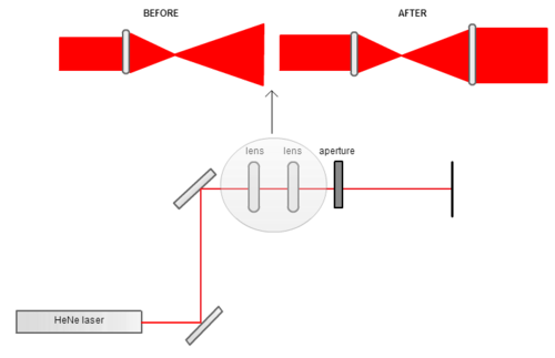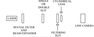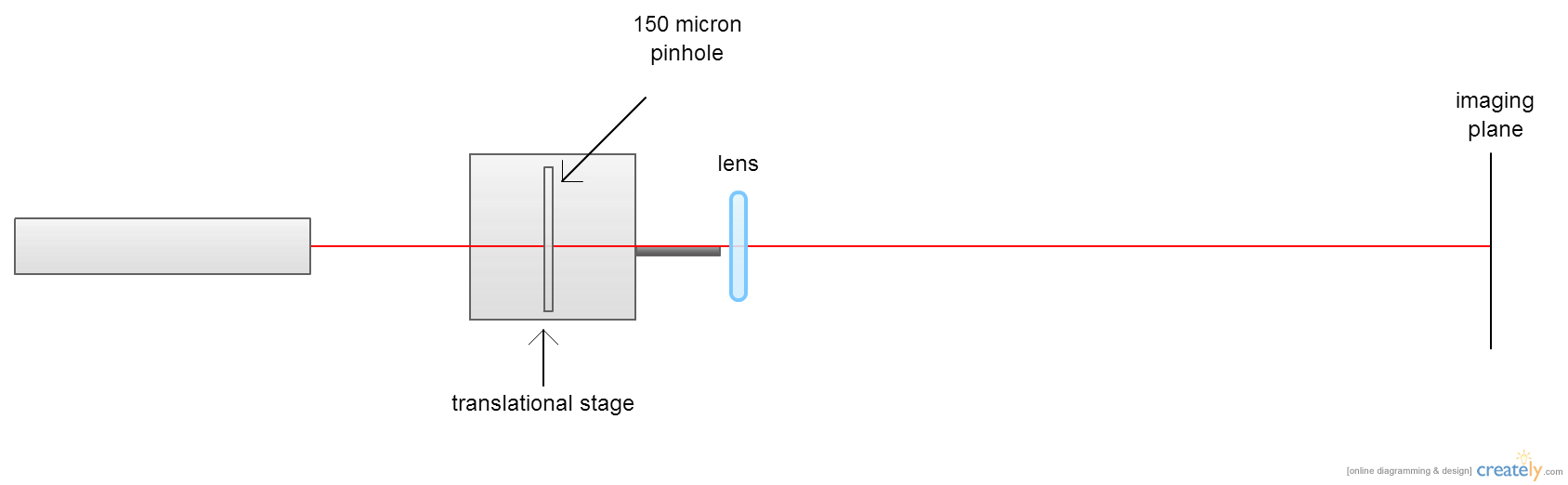 In the described collimator, the laser first passes through a sliding wedge-slit, which controls the intensity of the beam. This causes the beam to scatter, so a very small pinhole [in the paper a 50 μm pinhole was used] is placed immediately after the wedge slit. The pinhole must be small enough that the phase difference between the light that passes through the extremes of the aperture is much less than the wavelength of the light. This allows the rays act as if they are parallel and making the illumination of the pinhole effectively uniform. The beam is then collimated using a converging lens placed one focal length in front of the pinhole. [In the paper, a 200mm lens was used, resulting in a 3mm radius beam.] An airy ring diffraction pattern forms after the light travels through the pinhole, but only the central disk of the pattern is needed to illuminate the sample, so an iris is used to eliminate the higher order lobes of the Airy pattern. After the laser travels through the collimator, a nearly parallel beam should emerge.