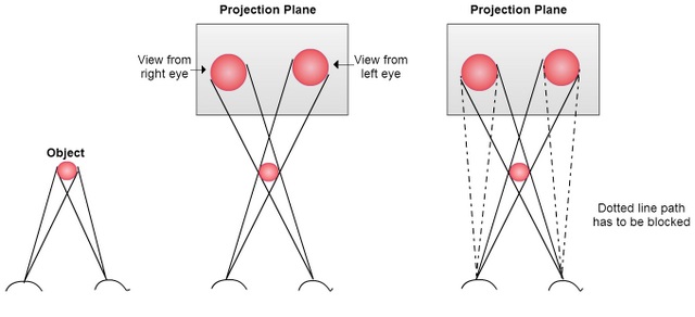 The first scatterometers required manual positioning of beam and motion control to record forward-scattering signature. This would require less programming and materials and would be easier to execute for a research project. I've heard the term light pollution a number of times throughout the years, usually in reference to how you couldn't see the stars any longer. I wasn't really too concerned because I thought it only affected astronomers. I realize now that light pollution has been getting progressively worse and has a wide range of adverse effects on not only astronomy, but also animal and human health. Astronomy Light pollution is making it harder for astronomers to observe the stars. Having to contend with "sky glow", the increased brightness in the background sky caused by light pollution, Astronomers often have to observe celestial bodies for longer periods of time to reduce the noise-to-signal ratio or increasingly, travel to remote locations, like Antarctica, in order to view the celestial bodies they are studying. Animals I hadn't thought about how light pollution would affect living organisms; light pollution has been shown to disrupt a number of animal behaviors though, often at the expense of the animals life. Loggerhead turtles for example have evolutionarily adapted to head towards the brightest light source after hatching. Traditionally, this has been the moon and stars reflecting off the water; nowadays, it is often hotels or parking lots. The loggerhead babies journey towards the hotels and parking lots only to meet their maker in the form of a car or dehydration. Bugs also often fly into lights killing themselves in the process. This can have a negative effect on an ecosystem by disrupting the food chain. Birds have also lost their way while migrating tricked by the lights and songbirds have been known to crash into brightly lit buildings killing themselves. Human health Light suppresses the secretion of melatonin in humans. Melatonin has been linked to inhibiting cancer growth and inducing sleep. Light pollution also poses a hazard to drivers and also causes a higher risk of malaria because mosquitoes are attracted to the light. ***On a side note, I've noticed it has been taking longer for my journal to load, so I moved all of my spring journal entries into the spring 2013 section of my webpage. *** June 19th, 2013Parallax is the difference in the apparent position of an object as viewed by the right and left eye. The parallax effect can be exploited to see 3D object. In the diagram below, the far left figure illustrates the path of light from an object directly in front of you into your eyes. While the diagram in the middle, shows how your eyes perceive two pictures of an object transposed on a projection plane the same as if the object were directly in front of you; the light paths between the center crossing points and the eyes are the same as they would have been if the ball were directly in front of you. Your eye does not distinguish a difference between these two objects. To achieve a 3D image though, each eye must only see one picture of the ball meaning that the dashed lines must be blocked, while the crisscrossing paths are allowed to pass [Situation illustrated in the far right figure]. This can be achieved by blocking the dashed lines with one's hands or by wearing horse blinder glasses.