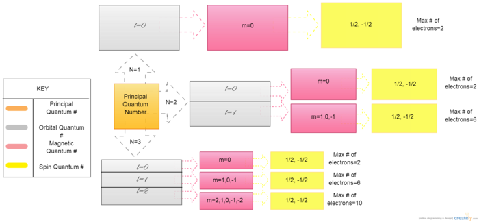 From the diagram, you can see that for N=1, there is a maximum of 2 possible electrons. Looking at the periodic table, you can see that in the first row there are two elements, which corresponds to the maximum number of electrons when N=1. As you progress down the periodic table, it is important to note that the number of elements in a row corresponds to the maximum number of electrons for a given principal quantum state. When l=1 that corresponds to the s(sharp) shell; when l=1, it corresponds to the p(principal) shell; when l=2, it corresponds to the d(diffuse shell; lastly, when l=3, it corresponds to the f(fundamental) shell.