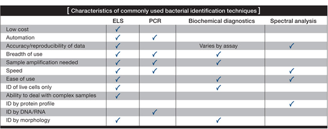 IntroductionFood contamination poses a serious threat to America, both to public health and to food companies that stand to lose millions of dollars. According to the Center for Disease Control, food-borne illnesses cause 300,000 hospitalizations and 5,000 deaths annually. Food-borne illness outbreaks also cost American industry about $7,000,000,000 in loses annually. The recall costs to food manufacturers include getting food off the shelves, lawsuits, revamping plants, and repairing public relations, which can very easily cost in the millions of dollars. Recall costs also don't take into consideration the cost of a tainted reputation and the loss of sales, which can often be hard to monetize, but which can devastate a company. As a result, the food and healthcare industry are constantly searching for better methods to rapidly and cost-effectively detect and identify pathogenic microorganisms. There are three main methods of detecting pathogenic microorganisms currently employed: biochemical identification, genetic tools (such as PCR and DNA fingerprinting), and spectral analysis (such as mass spectroscopy). While these methods are an obvious step-up from their predecessors, they are by no means the pinnacle of pathogenic microorganism detection. These methods can be slow, costly, and can require growth of the sample before testing. Elastic light scattering, ELS, is advantageous because it is cheap, quick, and requires a small sample size. Unlike the other methods, it is also quantitative. While the currently popular methods result in only a positive or negative result, elastic light scattering can provide us with a quantitative result as to how densely populated the pathogenic microorganism is within the sample. Below is a table comparing the features of ELS to the current popular methods.