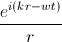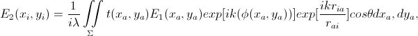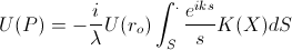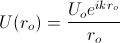 where k is the wavenumber, 2π/λ, and ro is the distance from the primary wave to the point source. The 1/ro arises from the intensity of light dropping off by a factor of 1/r and the kro is equal to the phase changes. I believe that eikro represents the phase modulation that the wave undergoes and Uo is the initial complex amplitude. The complex amplitude of the secondary wave is given by the equation: