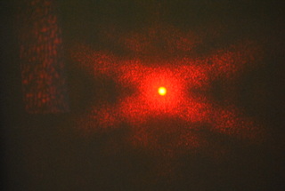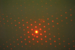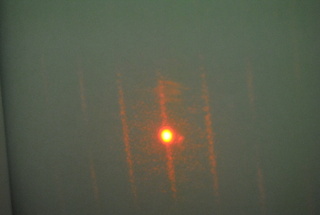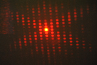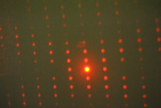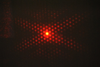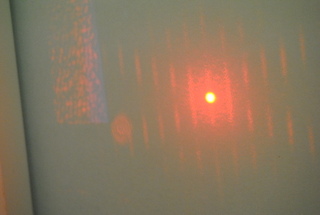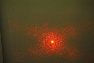 ![]() Once we got the set-up aligned, we shined the laser beam through the different arrangements of A's and observed the diffraction patterns. At first, I was suprised by the patterns we were getting, but as we went on it became more evident how they were formed. When we moved the paper close to the slide (about a foot away), we observed an x pattern for every arrangement of A's. When we moved further from the slide, different diffraction patterns arose that were related to the way the A's were arranged. For example, the row of A's produced bands of intensity similar to if there had been multiple slits. Dr. Noé' thought this was because at that the shorter distance we were in the far-field for the A, which caused the x diffraction pattern, but were not yet in the far-field for the overall pattern. ![]() ![]()