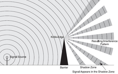 When radiation hits a well-defined object, a portion of the incident radiation is redirected as a result of diffraction. This phenomenon is referred to as the knife-edge effect, or edge effect. The behavior of the redirected light can be explained using the Huygens-Fresnel principle, which says a well-defined object that obstructs an electromagnetic wave will act as a secondary source and create a new wavefront. This phenomenon is responsible for the bright ring in the center of the Listeria scatter patterns. In Listeria colonies, the "knife-edge" is created by the difference between the transmission coefficients at the center and edges of the colony. At the center of the colony, transmission is influenced by the thickness [read a greater number of bacteria to absorb and/or scatter light] and the fact that the bacteria nearest to the agar surface are the oldest and have excreted the greatest amount of extracellular matter meaning there is a higher mass density. At the edges, transmission is greater because there are fewer and younger bacteria.