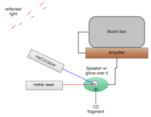 recipe. In not smoothie terms, the Fourier transform is breaks a function into its symmetrical, sinusoidal components. The 'goal' of Fourier transforms are to find the sources of an observed outcome. The smoothie-analogy might seem silly, but the article presents Fourier transforms in a very relatable way and I would recommend it to anyone trying to grasp what Fourier transforms are. Melia and I created diffraction patterns for the square and triangle aperture again, but this time Kevin took photos of them on his nice camera, so hopefully I will be able to put those up soon. I also added betterexplained.com to my links page. Betterexplained.com is a website that tries to explain math in the least 'mathematical way' possible, pulling in lots of examples and diagrams, the website makes it really easy to understand the concepts behind the equations and terms. July 3rd, 2013Today was awesome! To start off the day, Melia and I shined a laser through different apertures and observed the diffraction patterns. We tried it with a circular, triangular, and square aperture. I haven't had a chance to work with lasers yet and I found it rewarding to plan out the path of the laser and then align the mirrors, lens, and apertures, so that the laser beam traveled straight through.