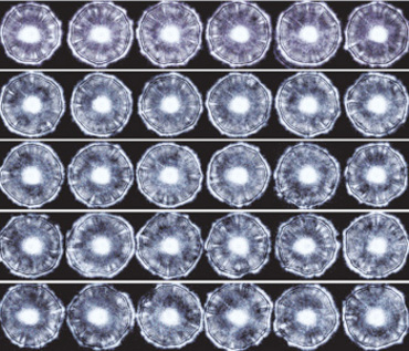 Speckle patterns are intensity patterns produced by the mutual interference waves. They result when many waves with the same frequency, but varying phase and amplitude interfere creating a wave with randomly varying amplitude [intensity]. Researchers found circular spots in Listeria ivanovii's scatter patterns which mirrored the speckle effect. The spots in the scatter pattern were caused by numerous circular spots in the center part of the colony (observed via microscopy) that acted as random phase modulations causing the speckling.