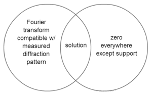 When both the phase and intensity of the diffraction pattern from an object are known, it is possible to reconstruct an object's image. The intensity of a diffraction pattern can be obtained by imaging the diffraction pattern, with for example a CCD camera. [The intensity is also proportional to the square of the amplitude of the Fourier transform of an object image.] The phase cannot be directly obtained using diffraction measurement though. This is referred to as the phase problem. Oversampling is a solution to the phase problem. Oversampling occurs when the sample to be reconstructed is surrounded by a sufficiently-large uniform and featureless area. A small sample area, support, compared to the field of view can provide enough constraint to ensure uniqueness of the solution. By assuming that the area not within the support has zero density, when the zero density region is larger than the support, more than half of the total information about the object is known in real space, which makes it possible to make up for the missing phase information. By sampling the diffraction pattern sufficiently finely, the phase problem is over-constrained, meaning no solution exists which satisfies all the constraints, and the reconstruction is unique. Oversampling works because while there is more than one image whose Fourier transform is consistent with the measured diffraction pattern and there is more than one image that has zero values everywhere except within the support, if you oversample a sufficient amount, there will only be one image which meets both of these conditions. This principle is demonstrated in the Venn diagram below.