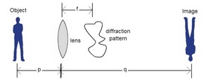 ![]() Lens are able to retrieve an image that has the same shape as the original object. The lens brings the diffraction pattern in from infinity and retransforms the diffraction pattern into an image. The Fourier transform [diffraction pattern] reorganizes the information and the lens organizes it back.