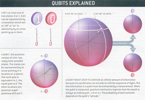 The talk organized by Eden was given by Dr. Sotir Chervenkov, a scientist from the Max Planck Institute who is currently researching the production of ultracold polyatomic molecules. The motivations behind his group's research are to gain a better understanding of how molecules interact at low temperatures (essential to understanding molecule interactactions in space), more accurately measure the magnetic dipole moment, study fundamental physics, and eventually reach quantum degenerate regimes. His group was employing three different methods to cool the molecules with the end goal of devising a system combined all three and cooled the molecules to extremely cold temperatures. Up to this point, they have been able to cool the molecules to milli-Kelvins. Eden's lab was quite impressive. I hadn't realized that his research deals with quantum computing. After reading his website, I now realize that he is the head of the Quantum Information Technology Group at Stony Brook. His lab hopes find the quantum equivalents of the computer elements (logic gates, bits) we have now, which obey the laws of classical physics. Their first goal is to find a way to collect the information and then find a way to store said information. Below is a graphic illustrating the differences between bits and qubits, their quantum equivalents.