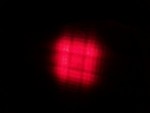 After we fixed the set up, we reobserved the diffraction patterns. The circle and triangle looked pretty similar to the original patterns we had created. The diffraction pattern from the square aperture however looked more like the patterns I had seen online. [We were able to create a cleaner diffraction pattern than the one pictured below by adjusting the lenses in the beam expander, however I do not have a picture of the cleaned up pattern.]