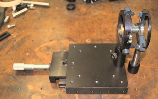 July 25th, 2013I replaced the lens in my set up with a 10x microscope objective because the objective magnifies the pattern more. The magnification of the objective is about 140x. Its focal length is about 1.6 cm. Marty suggested that I try imaging the aperture, rather than the plane where N=2 because this would magnify the pattern along all three dimensions (x, y, and z). We tried this and it was successful. By moving the imaging plane (a piece of white paper) up and down the path of the beam, we were able to observe the pattern change as the Fresnel number changed. In order for the objective to image the aperture, it has to be very close to the aperture (~4mm); it was very difficult to get the aperture close enough. After trying a number of convoluted- and unsuccessful- methods to get the objective close enough, I was finally able to devise a simple way to get the objective close enough using a lens holder.