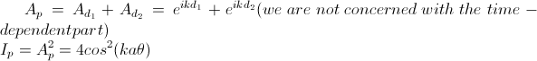 We talked some about binomial expansions and Euler's formula and some other useful equations and then Dr. Noé asked us to formulate an equation for the amplitude and intensity of a wave at a point P on a plane in the far-field. We found the amplitude and intensity to be equal to