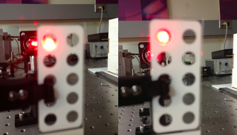 circular hole where the water droplet is placed. The right image shows the laser beam in the center
