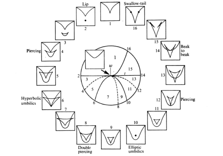 catastrophes, such as the elliptic umbilic, hyperbolic umbilic, and parabolic umbilic. Investigation