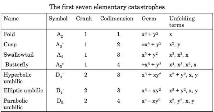 catastrophes, for any given number of dimensions in control space or codimension (Table 1 from