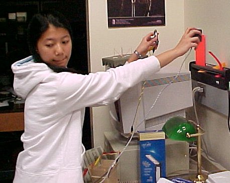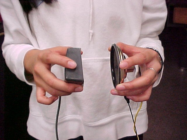 Measuring the Velocity of SoundInterestingly we can measure the velocity of sound by doing what we have been doing. However this time we'll need the help of a ruler. We moved the microphone away from the speaker until the fuzzy curve on the oscilloscope had shifted by one complete wavelength. We measured that distance to be 7.0 inches with an uncertainty of a quarter of an inch. The frequency is 2000 Hz; we know this because we can set it in the oscillator. Using the relationship velocity = (frequency)(wavelength)we found the velocity of sound to be 356 m/s. According to this speed-of-sound calculator, the speed of sound at 25 degrees C is 346 m/s. That number is pretty close to our measurement! Who could ever guess it is possible to measure the velocity of sound this way?!?! Making Standing WavesBy holding the speaker towards a wall we demonstrated standing waves. Standing waves are formed when the sound wave coming from the speaker reflects off the wall and interferes with the outgoing sound wave. Even if we moved the microphone like we did to demonstrate the phase shift previously, there was no phase shift! But we did see changes in the amplitude. The nodes (where the amplitude is the lowest) were actually 3-1/2 inches apart just as expected for a standing wave. ConclusionI've learned from this project that to build a noise cancellation earphone requires a lot of work. The earphone has to be able to convert the noise into an electronic signal that is out of phase with the actual noise. However as we have discovered we have to also consider the distance between the microphone on the outside of the headphones and the loudspeaker on the inside. Depending on the frequency of the noise the phase can change significantly between these two places. It was also very interesting that we can find the velocity of sound, by using all we had. Although I had wished to make noise cancellation headphones myself, I still learned a lot about the concepts involved from this project. Special thanks to Dr. Noe, for his patience, brilliant ideas and the many fascinating demonstrations he showed to us. |